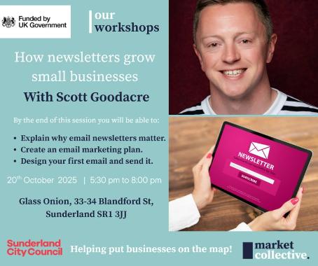 Hands-on workshop covering why email newsletters matter, how to design your first one, and how to grow your subscriber list. Monday, 20 October, 5:30 - 8pm at The Glass Onion, Blandford Street, Sunderland.